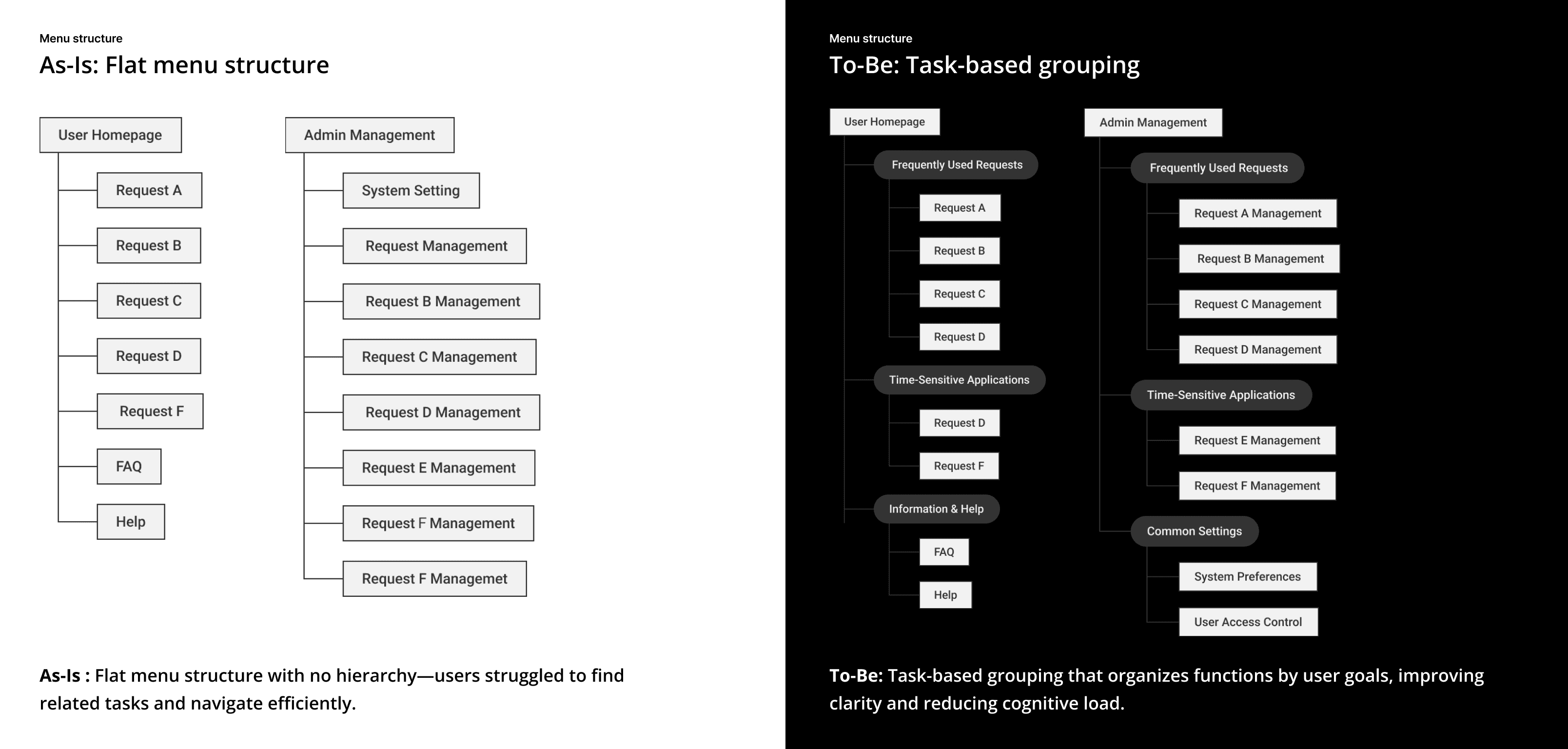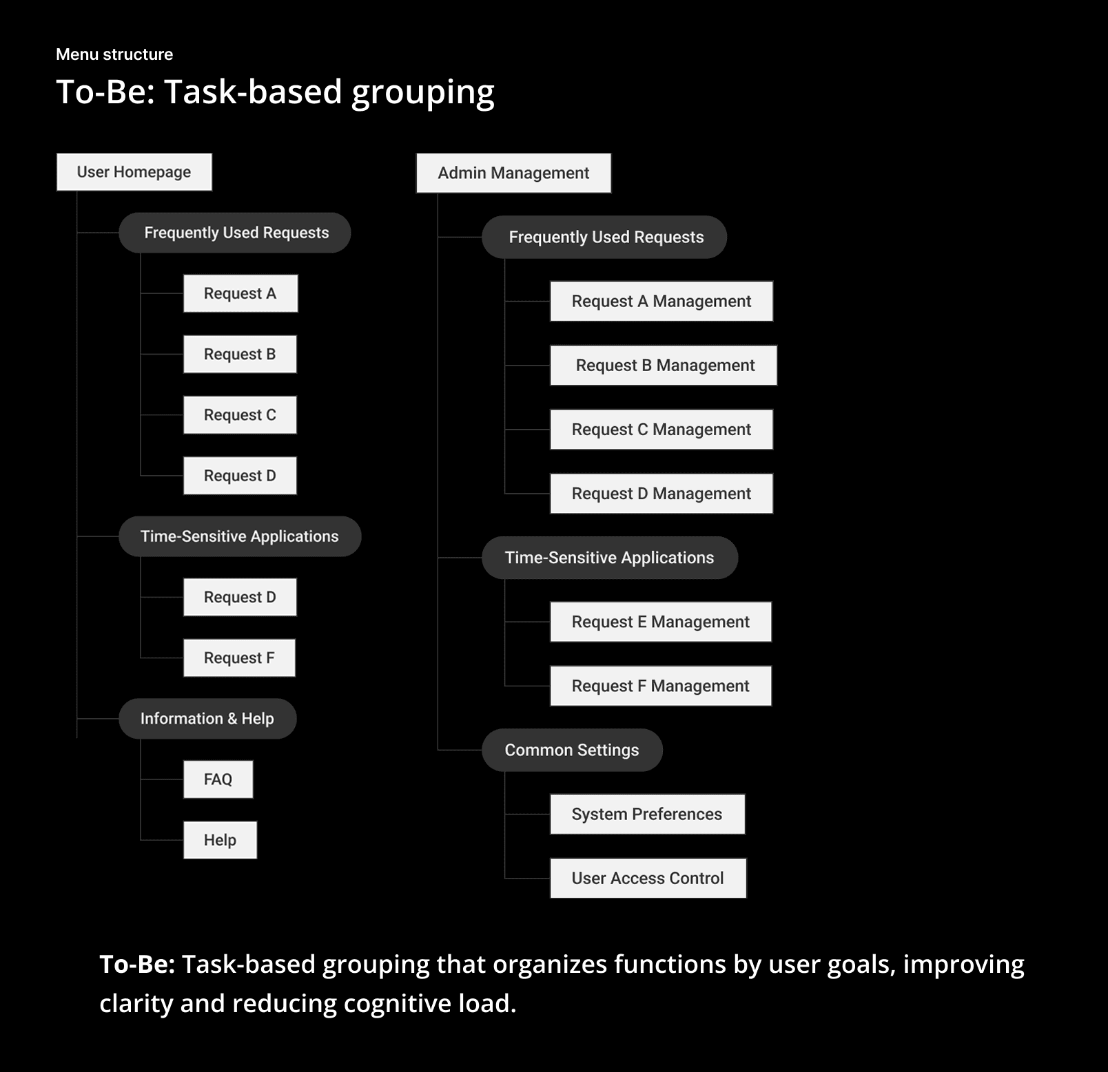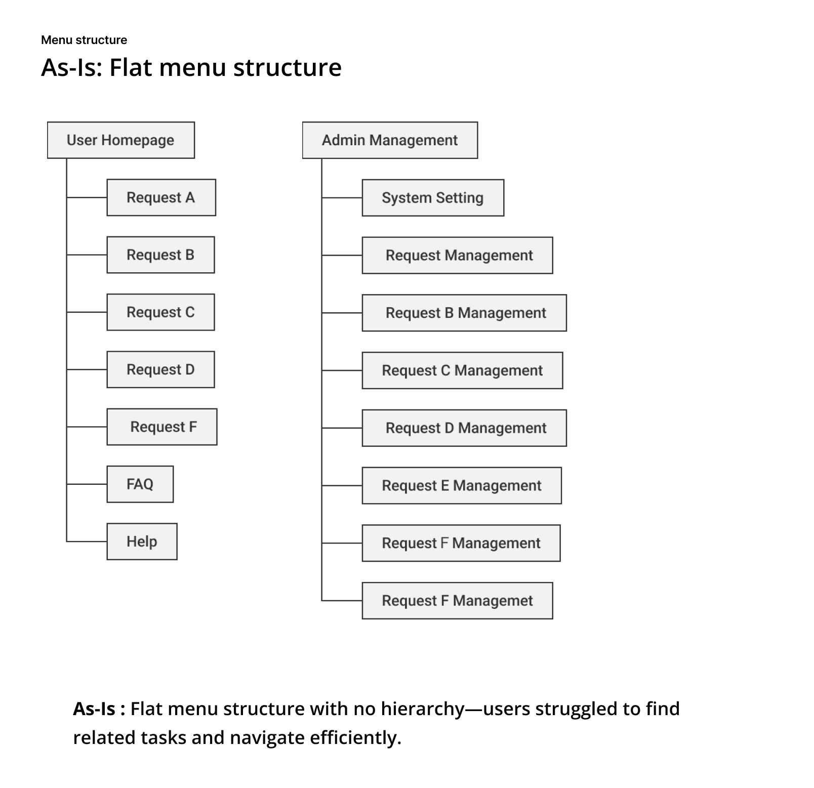 The legacy admin system featured a flat menu with no clear hierarchy or grouping. Core functions, such as request management, system settings, and user roles, were listed side by side, making it difficult for users to locate features or understand how tasks were related.Stakeholder Interviews