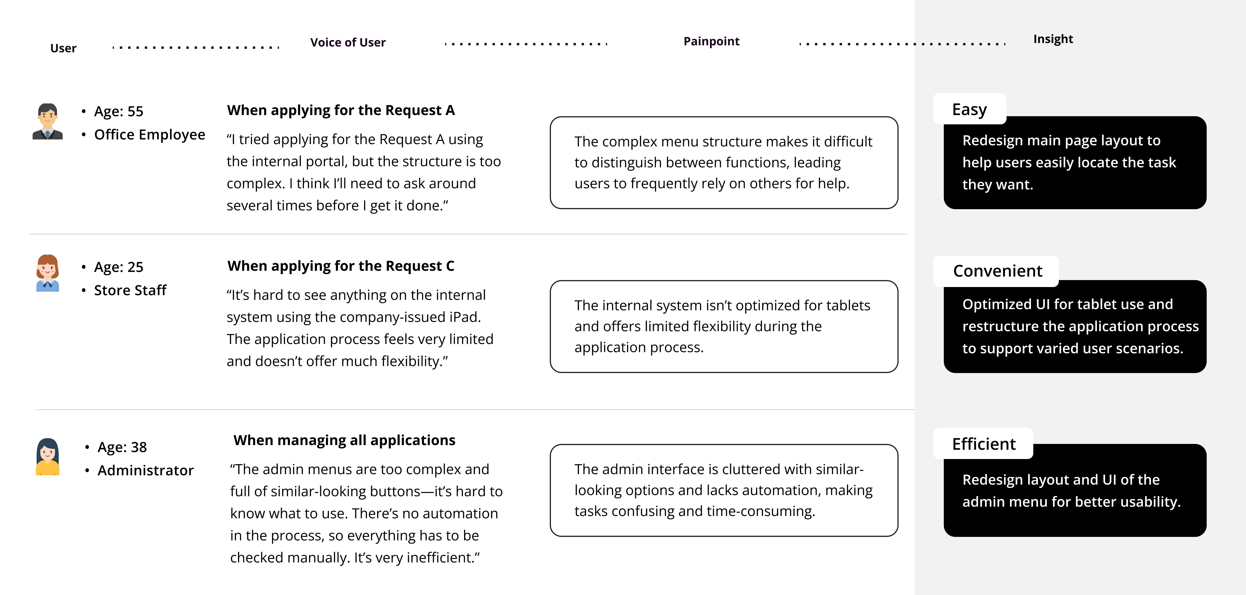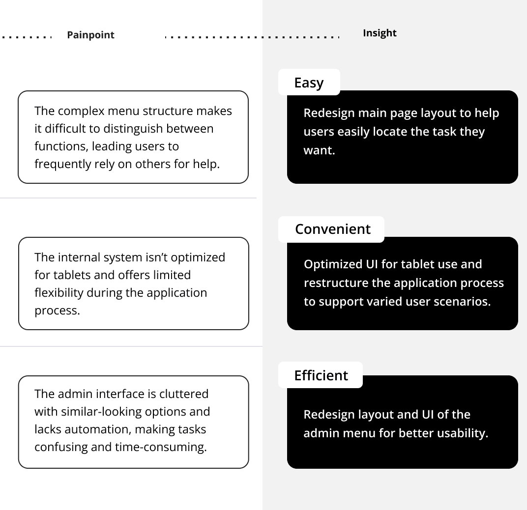 Conducted interviews with both system managers and end users to uncover pain points from an operational and usability perspective, helping align the redesign with real needs.