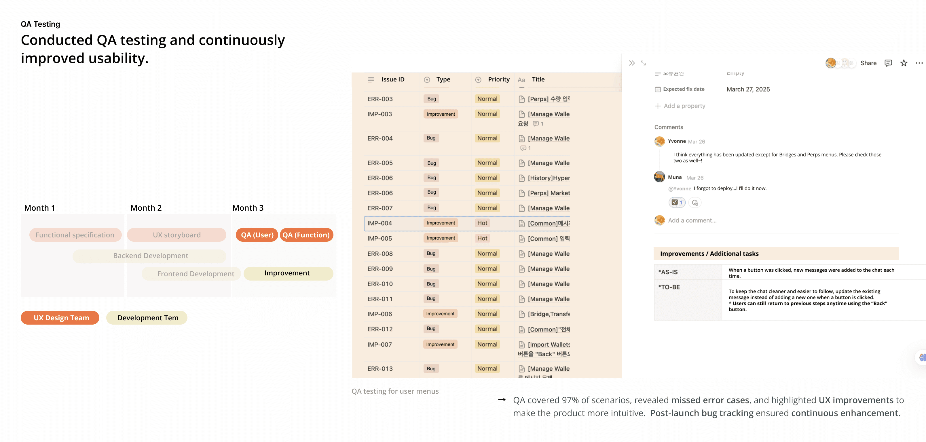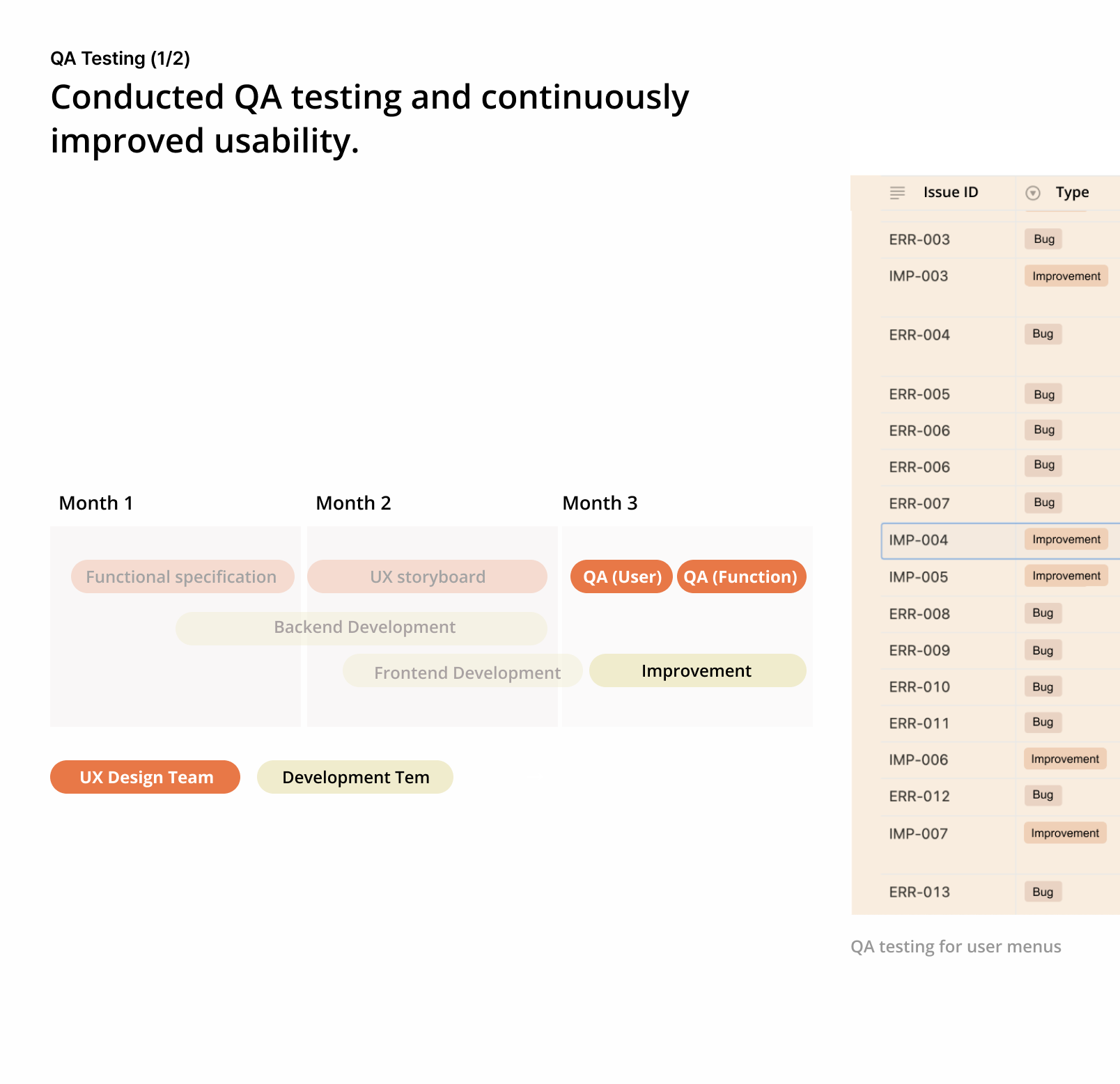 Before launch, the product required thorough testing to ensure a smooth user experience. To achieve this, I split seven menus into user and function menus and conducted two rounds of QA in Month 3, checking UI details, verifying end-to-end flows, and testing exception cases to ensure robustness.
