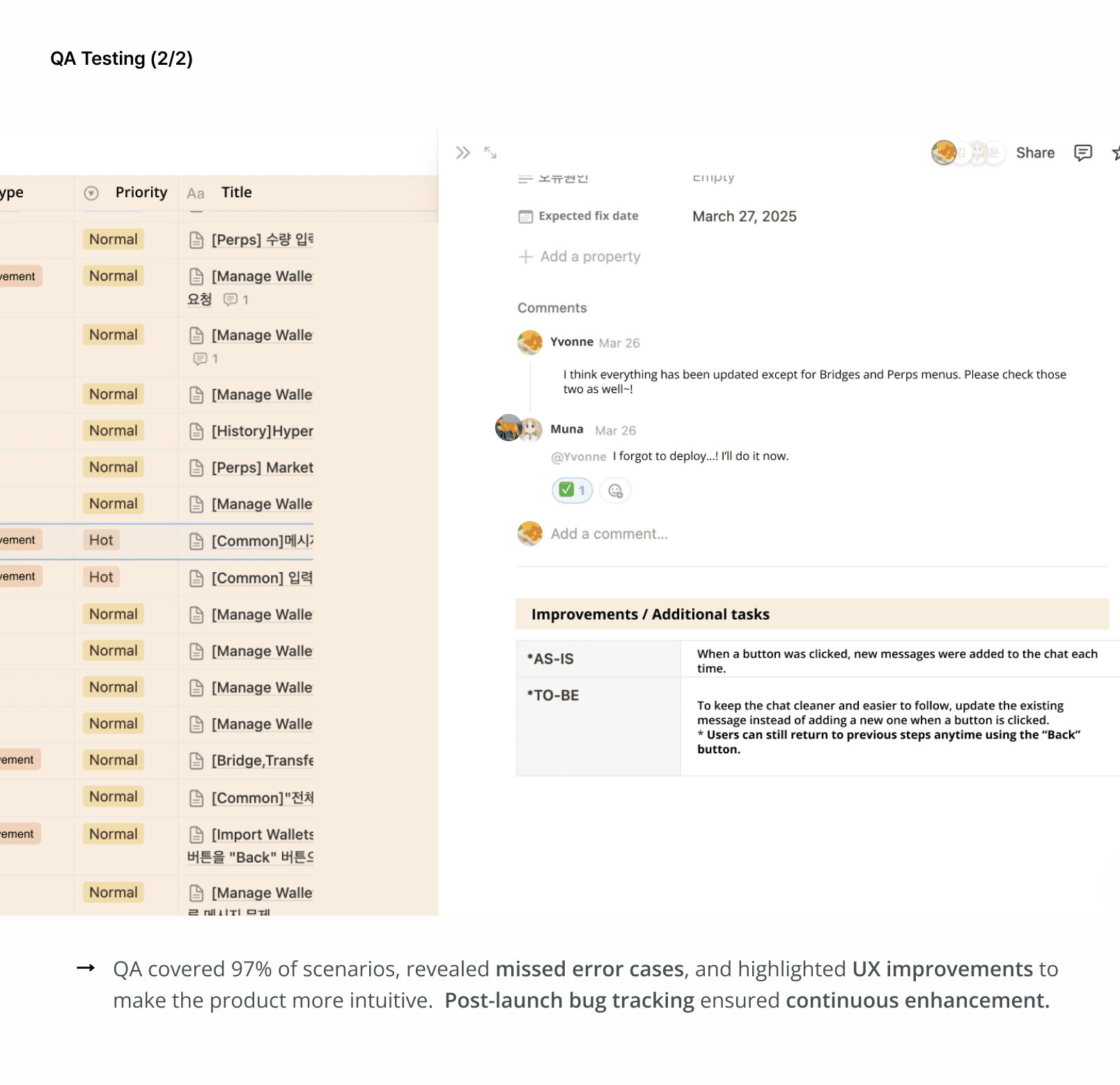 As a result, QA covered 97% of scenarios, revealed errors and UX improvements for a clearer, more intuitive experience, and post-launch bug tracking ensured continuous enhancement.