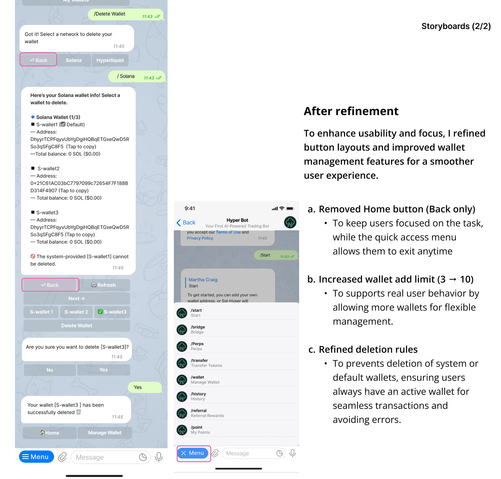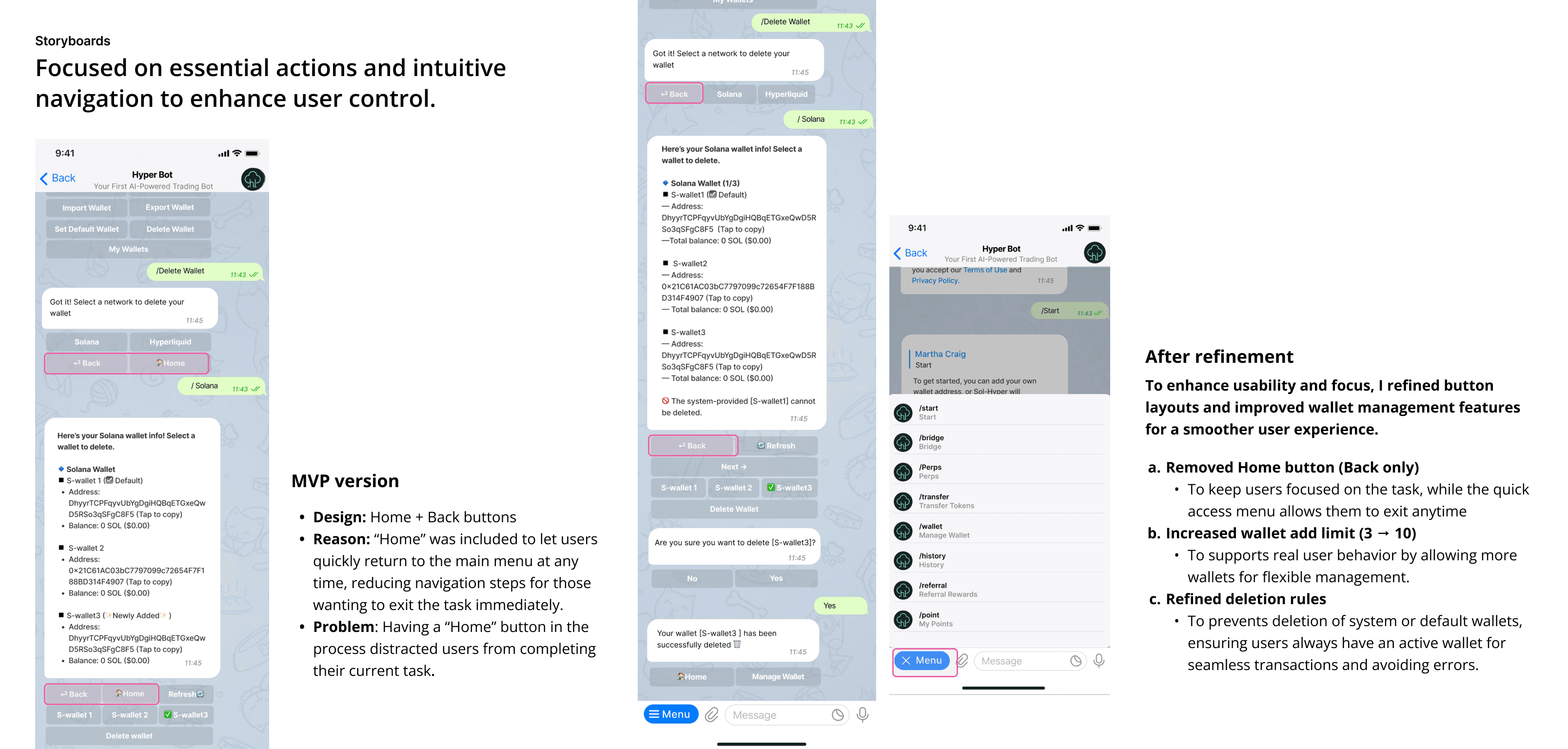 When we launched the MVP, we quickly realised that performance issues were limiting the user experience, so we switched to a new development language. Designing for Telegram bots also posed challenges, as its limited UI space and multi-purpose buttons (menus, CTAs, inputs) could easily overwhelm users and break the conversational flow. We needed to prioritise actions for complex tasks like wallet management while keeping the interface clear, intuitive, and easy to navigate.